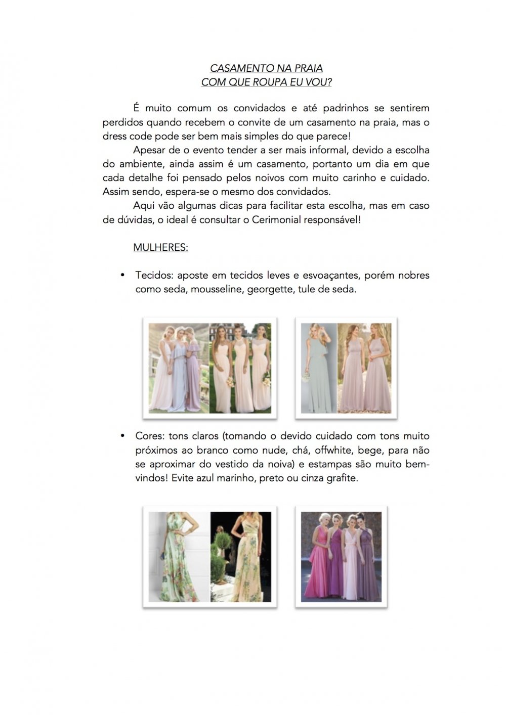Esperamos que vocês se sintam confortáveis neste dia tão especial. A recomendação é passeio ou Social. Lembramos que o casamento ocorrerá na praia, durante o dia.